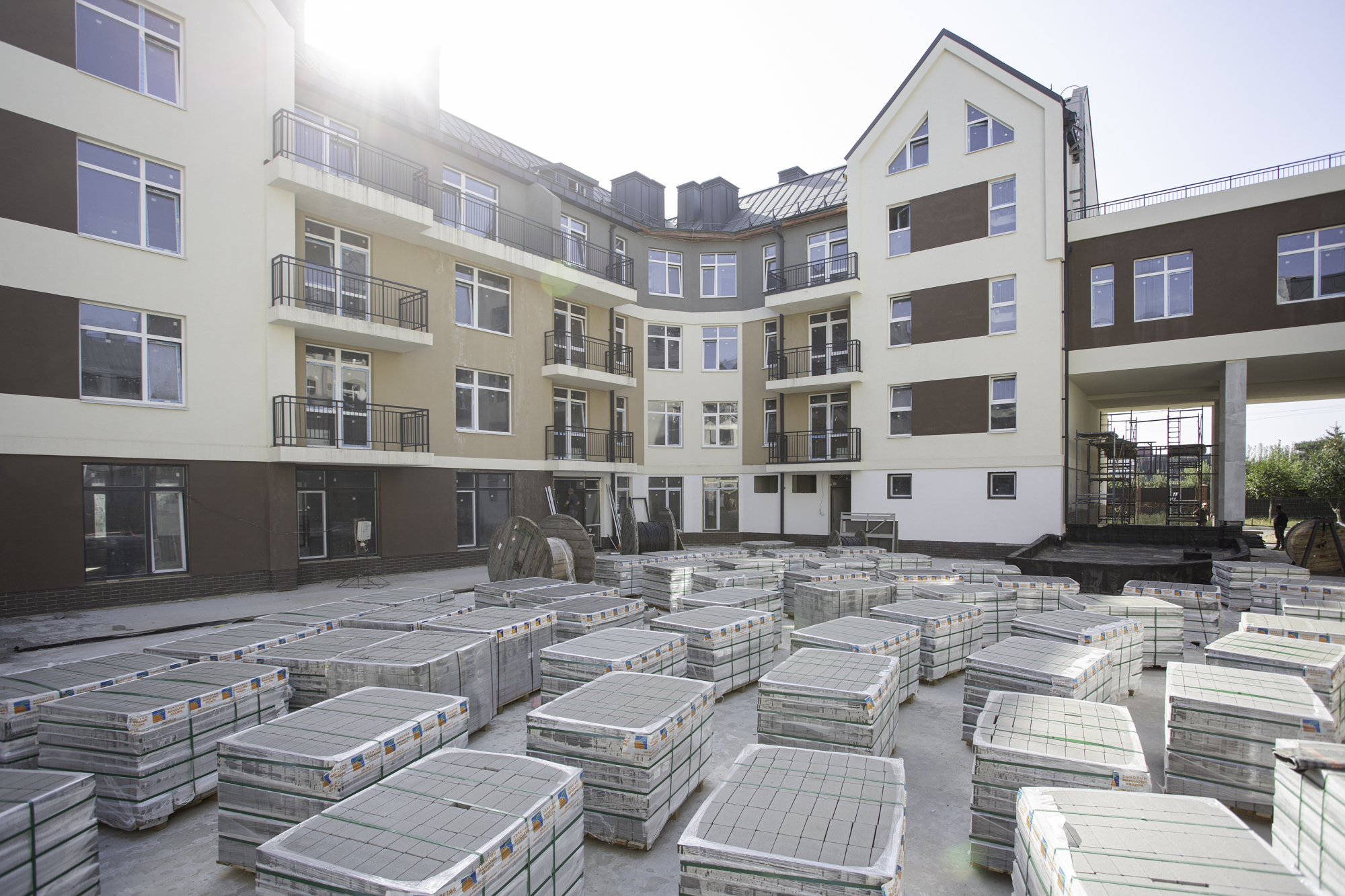 На придомовой территории продолжается благоустройство территории: устраивают борта и лотки. Стартовал монтаж фигурных элементов мощения.